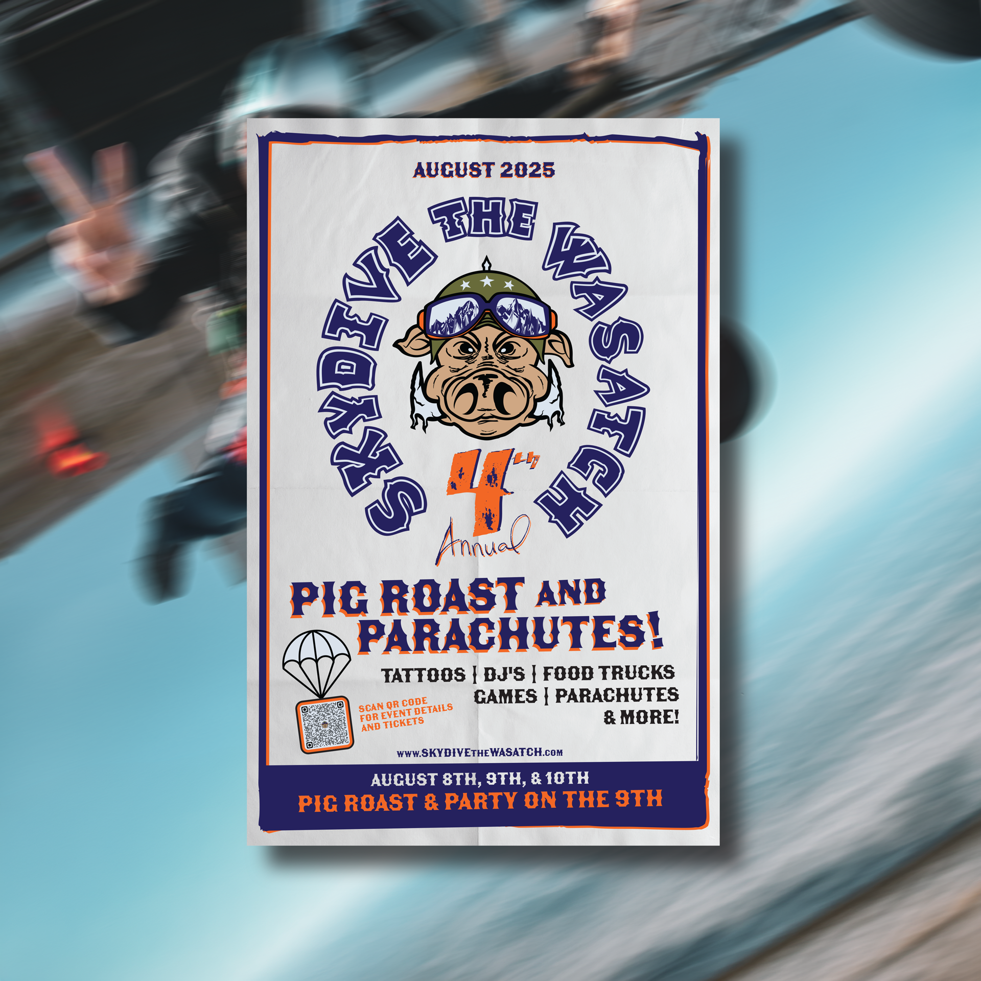 What started out as patches quickly turned into promotion for their 4th Annual Pig Roast and Parachutes Annual party! After seeing the initial sketches of the design the owner was very excited and quickly moved to have shirts, stickers, and poster promo created to market for the annual event.